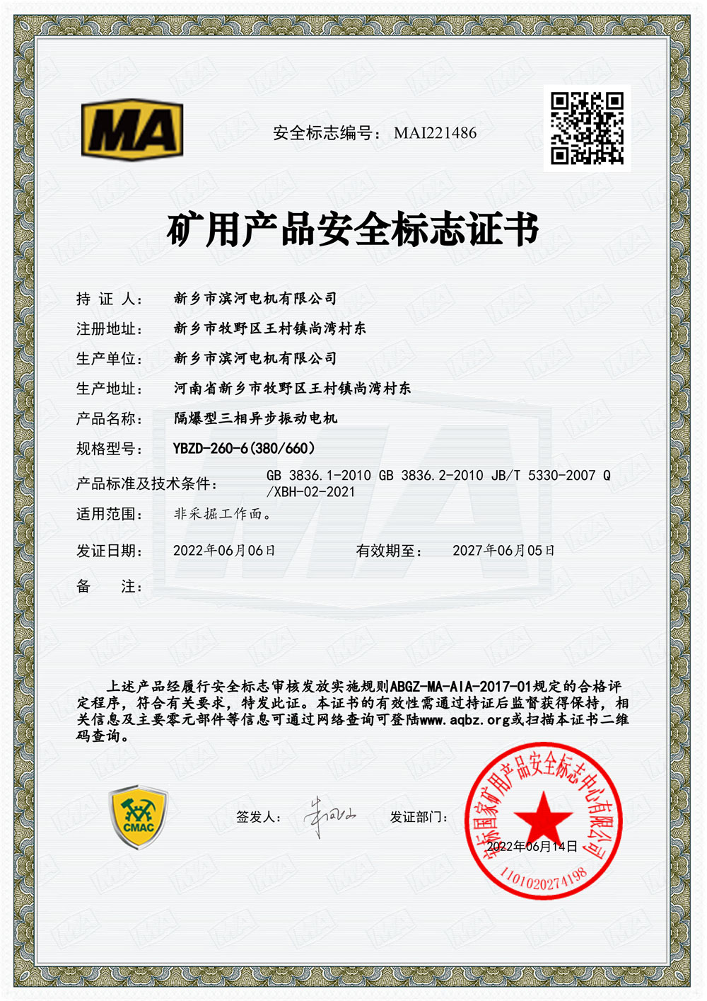 礦用產(chǎn)品安全標志證書 安標國家礦用產(chǎn)品安全標志中心有限公司 2022-06-06 2027-06-05