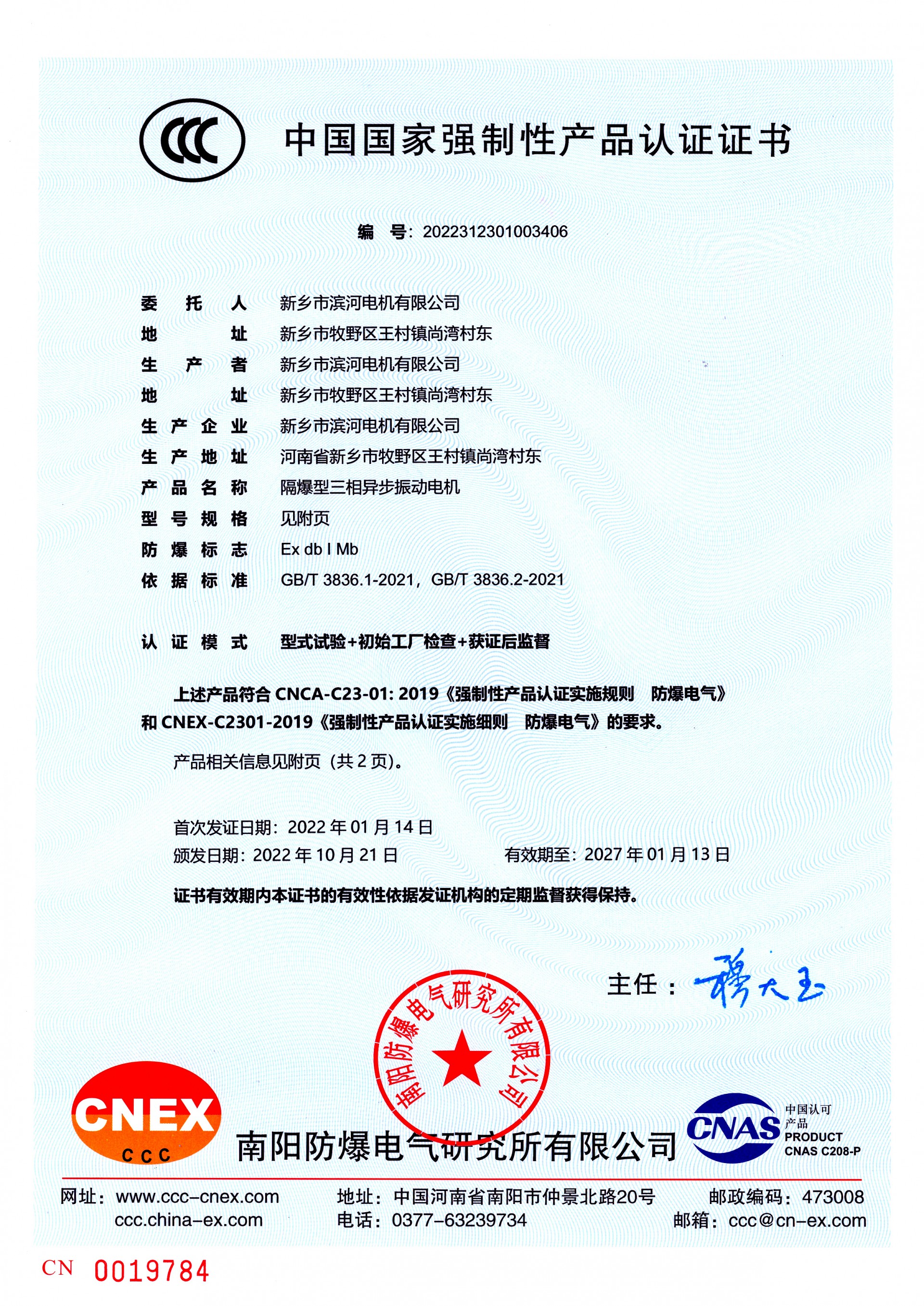 中國國家強制性產(chǎn)品認證證書 南陽防爆電氣研究所有限公司 2022-01-14 2027-01-13