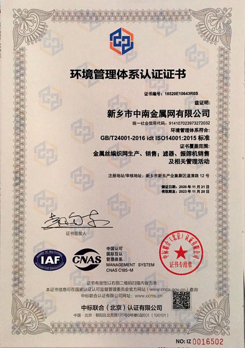 環境管理體系認證證書 中標聯合認證有限公司 2020-11-21 2023-11-20