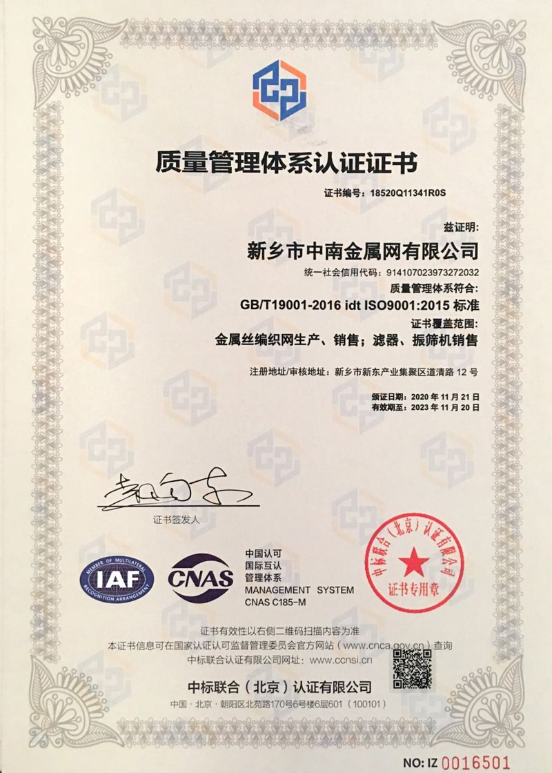 首頁 > 榮譽資質 > 質量管理體系認證證書