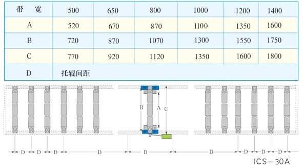 ISC-30A型電子皮帶秤,該秤架為全懸浮式結構,無耳軸支點,采用了二只壓傳感器,可有效解決偏載的問題。該秤架主要安裝在進出料口中心距較短的給料機上,也可安裝在傾角隨時變化的皮帶輸送機上。