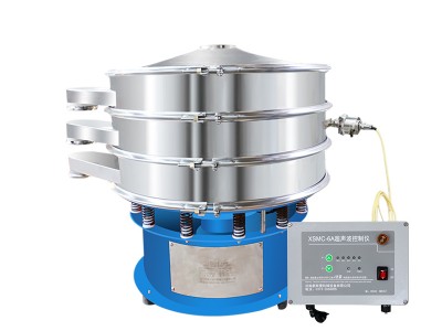 超聲波振動篩是將220V、50Hz或110V、60Hz電能轉化為36KHz的高頻電能,輸入超聲換能器,將其變成36KHz機械振動,產生的功率超聲波使篩網作高頻振動。篩網上的物料在作低頻旋振運動的同時,疊加上超聲振動,既可防止網孔堵塞,又可使篩分機提高產量和質量,從而達到快速篩分和清網的目的,使超微細粉篩分成為易事。該系統在傳統的振動篩基礎上在篩網上引入一個低振幅、高頻率的超聲振動波(機械波),以改變超微細分體的篩分性能。新斯曼系列超聲波旋振篩是在旋振篩基礎上加裝了一套超聲波篩分系統,能有效解決物料:強吸附性、易團聚、高靜電、高精細、高密度、輕比重等篩分難題,具有優越的性能!篩分精度比普通旋振篩可提高1—70%,產量可提高0.5-10倍。干粉粒度可分級到25μm(600目)。特別適合高附加值精細分體的用戶使用