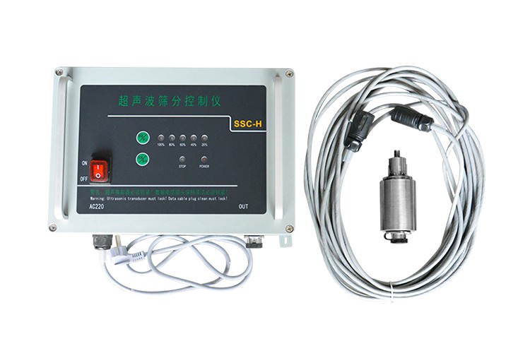 超聲波篩分系統由超聲波控制儀、轉換器、共振環組成。超聲波控制儀產生的高頻電振蕩由轉換器轉換成高頻正弦形式的縱向振蕩波,這些振蕩波傳到共振環上使共振環產生共振,然后由共振環均勻傳輸至篩面。篩網上的物料在做低頻三次元振動的同時,疊加上超聲振動,既可防止網孔堵塞,又可使篩分機提高產量和質量。
