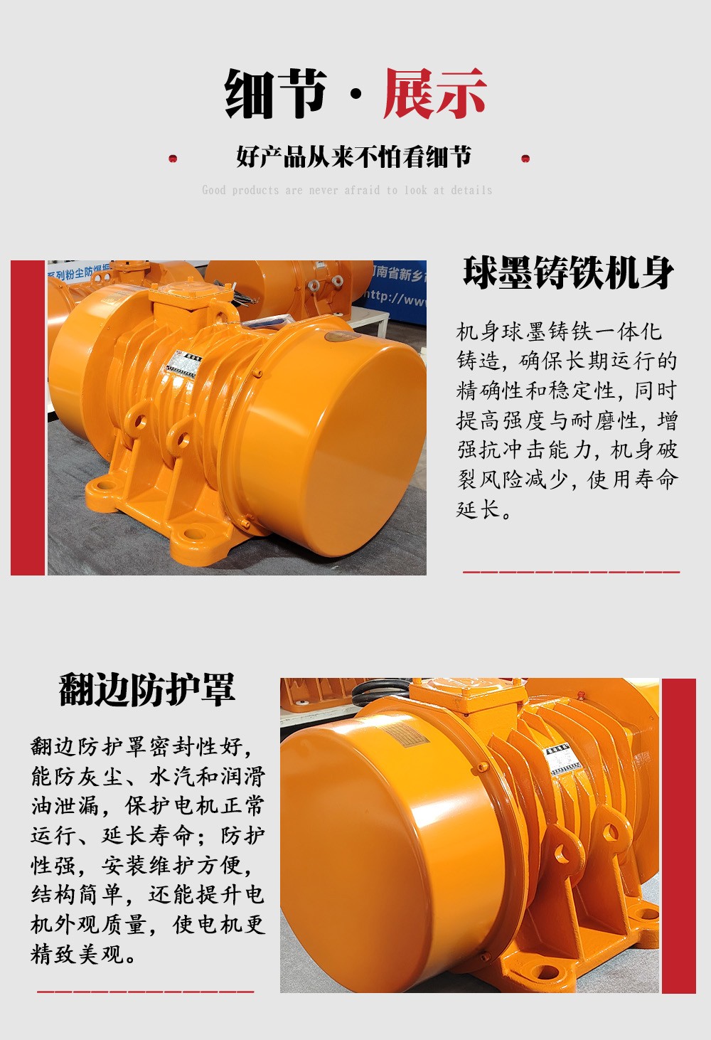 優(yōu)化設(shè)計:增加了翻邊防護罩和散熱筋,使用樹脂砂外殼,提高了電機的散熱性能和防護能力。