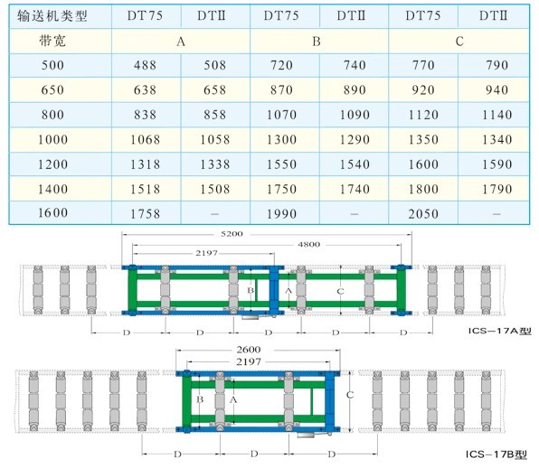 17B型雙托輥,稱重區為17A的1/2,適用于給料距離較短的皮帶輸送機。