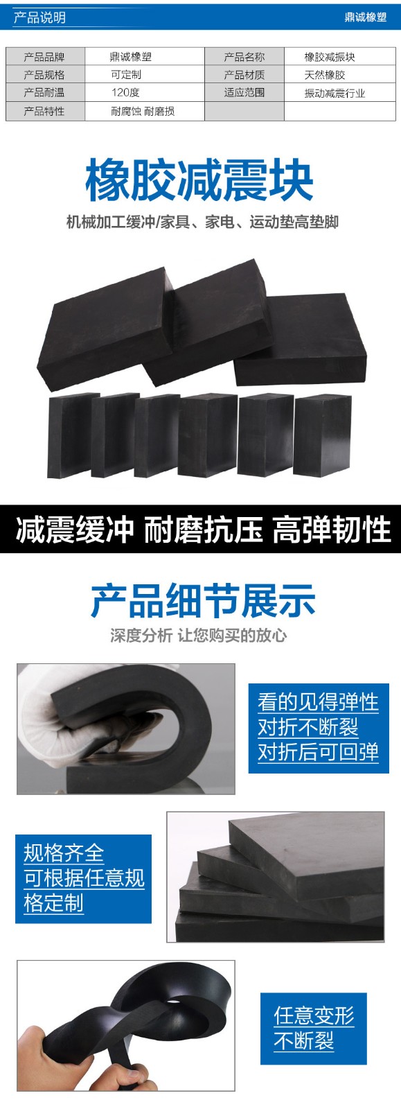 工業橡膠板防震橡膠墊塊橡膠減震墊緩沖墊加厚長方塊防撞膠皮高彈