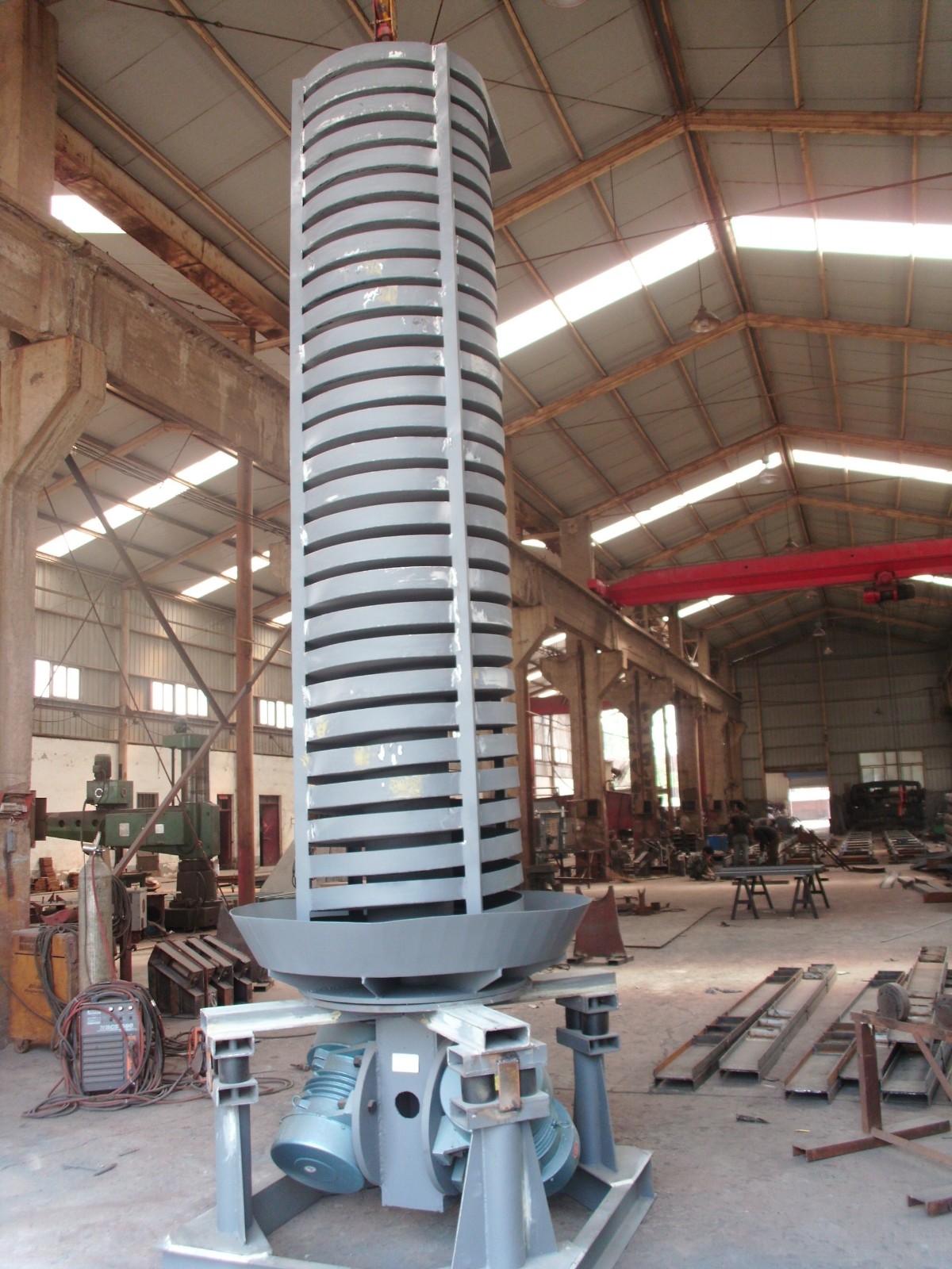 當垂直提升機工作時,根據雙振動電機自同步原理,由振動電機產生激振力,強迫整個輸送塔體作水平圓運動和向上垂直運動的空間復合振動,螺旋槽內的物料則受輸送槽的作用,作勻速拋擲圓運動,沿輸送槽體向上運動,從而完成物料的向上(或向下)輸送作業。