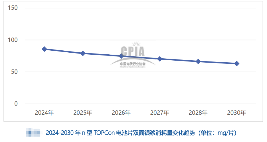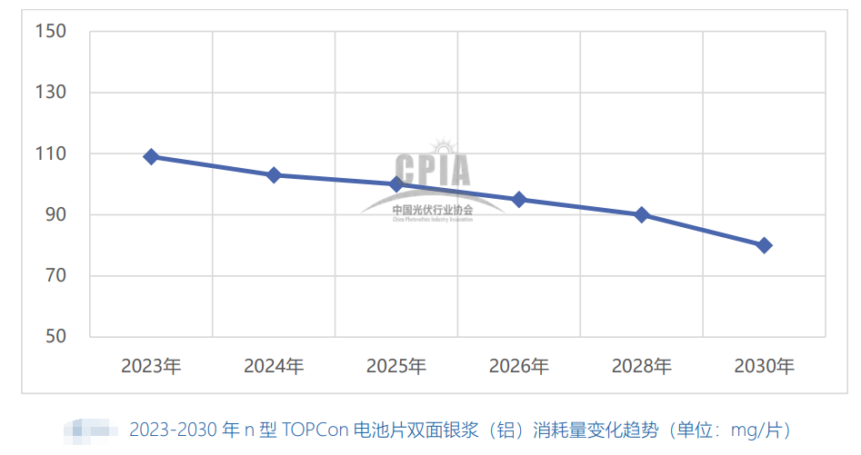 (2)n型TOPCon電池雙面銀漿平均消耗量約86mg/片,由于2024年激光誘導(dǎo)燒結(jié)技術(shù)(Laser Induced Firing,LIF)對激光選擇性發(fā)射結(jié)技術(shù)(Laser Selective Emitter,LSE)的大規(guī)模替代,TOPCon電池已無需使用銀鋁漿;同時由于未來0BB、賤金屬等技術(shù)的大規(guī)模應(yīng)用,銀漿耗量將加速下降。
