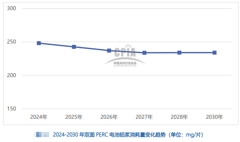 除了電池銀漿以外,該路線圖對主要為晶硅電池片中鋁背場消耗的鋁漿的消耗量也做了說明:隨著雙面PERC電池技術(shù)的發(fā)展,電池片鋁漿平均消耗量保持下降趨勢。2024年雙面PERC電池片鋁漿消耗量約為248mg/片。隨著未來PERC技術(shù)逐漸退出市場,每片電池耗鋁量的水平預(yù)計在2027年以后保持停滯。