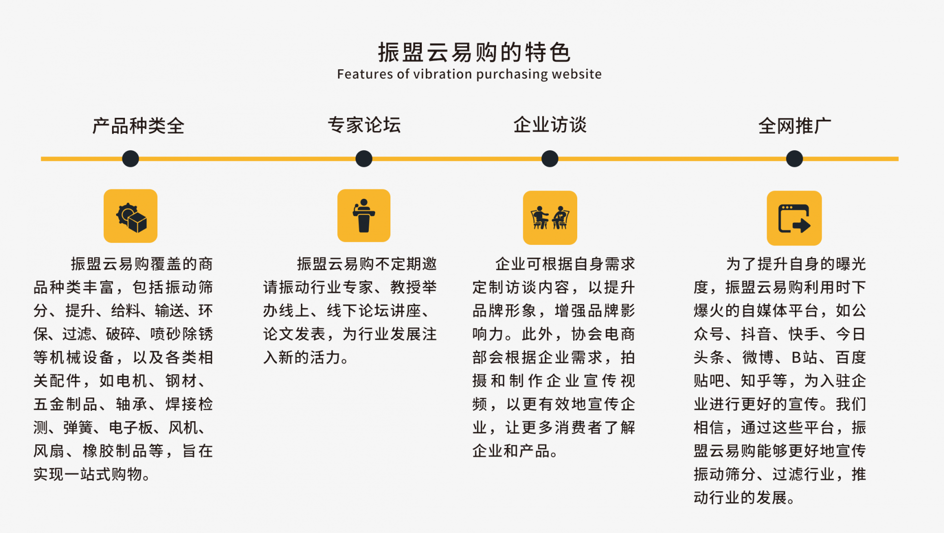 在新電商時代的浪潮中,振盟云易購以其全面的服務內容、創新的服務模式以及強大的資源整合能力,為振動篩分、過濾領域的企業提供了一個高效、便捷、互利共贏的發展平臺。如果您還在為采購渠道不暢通、品牌推廣無門、市場信息匱乏等問題而煩惱,不妨選擇振盟云易購,讓我們攜手共進,開啟振動行業的新篇章!立即登錄振盟云易購(http://m.ikrout.com),體驗一站式采購服務的魅力!