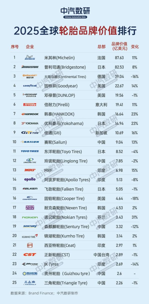 在榜單的頭部陣營中,傳統輪胎巨頭依然占據主導地位。法國的米其林以87.63億美元的品牌價值連續八年蟬聯榜首,同比增長11.3%;而日本的普利司通和德國的大陸馬牌則緊隨其后。