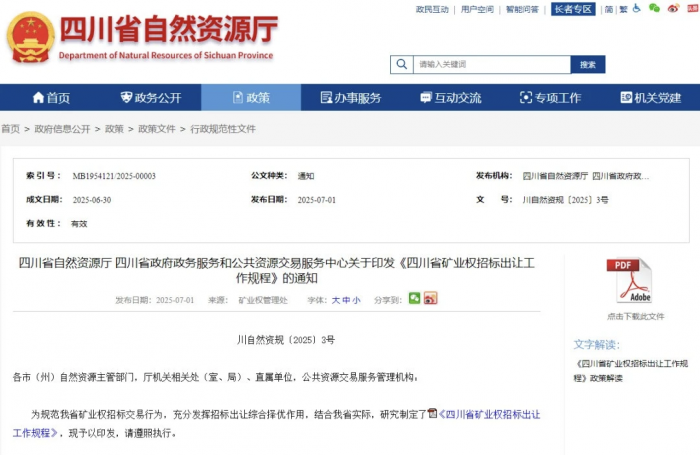 近日,四川省自然資源廳與四川省政府政務(wù)服務(wù)和公共資源交易服務(wù)中心(以下簡(jiǎn)稱省政務(wù)服務(wù)和資源交易服務(wù)中心)聯(lián)合發(fā)布《四川省礦業(yè)權(quán)招標(biāo)出讓工作規(guī)程》和《四川省省級(jí)礦業(yè)權(quán)出讓網(wǎng)上交易規(guī)則》,兩項(xiàng)新規(guī)將于8月1日起正式施行,有效期5年。這是四川省首次為礦業(yè)權(quán)招標(biāo)出讓單獨(dú)制定操作規(guī)程,并與升級(jí)后的網(wǎng)上拍賣、掛牌規(guī)則形成“雙軌并行”體系,進(jìn)一步規(guī)范礦業(yè)權(quán)出讓網(wǎng)上交易和招標(biāo)出讓行為,優(yōu)化流程、提升效率。