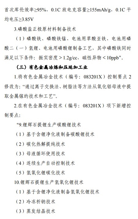 二是新增1項限制類技術條目,即電池正極材料制備技術,包括:新增電池用磷酸鐵鋰制備技術、電池用磷酸錳鐵鋰制備技術、磷酸鹽正極原材料制備技術等3條控制要點。電池正極材料制備技術在敏感領域正越來越多地得到應用,將相關技術納入《目錄》限制類,有利于更好統籌發展和安全,促進相關技術的安全、可持續的應用和發展。