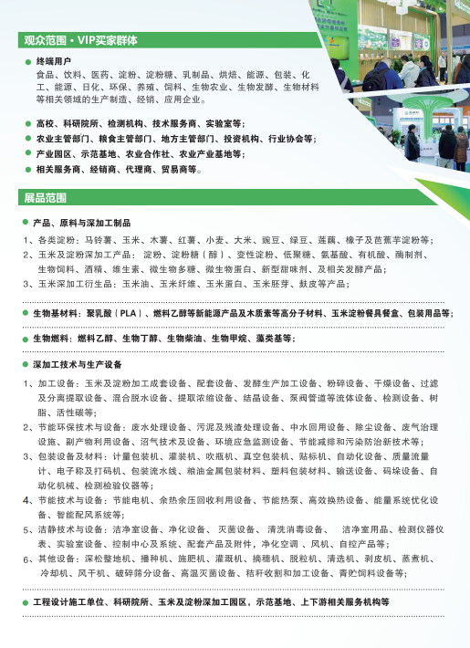 展品范圍:包括各類淀粉、玉米及淀粉深加工產品、生物基材料、生物燃料、深加工技術與生產設備,以及工程設計施工單位、科研院所等相關服務機構等。