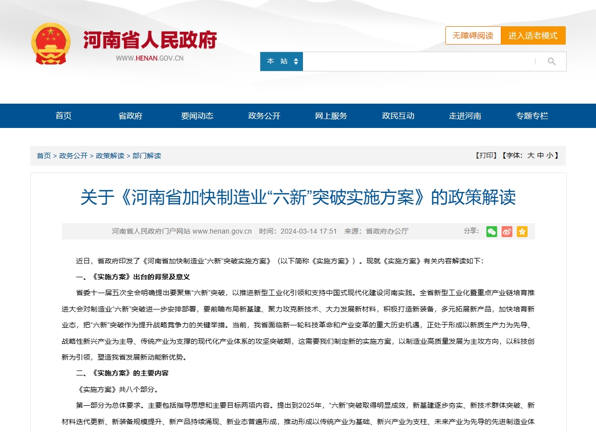 近日,省政府印發(fā)了《河南省加快制造業(yè)“六新”突破實(shí)施方案》(以下簡(jiǎn)稱(chēng)《實(shí)施方案》)。現(xiàn)就《實(shí)施方案》有關(guān)內(nèi)容解讀如下: