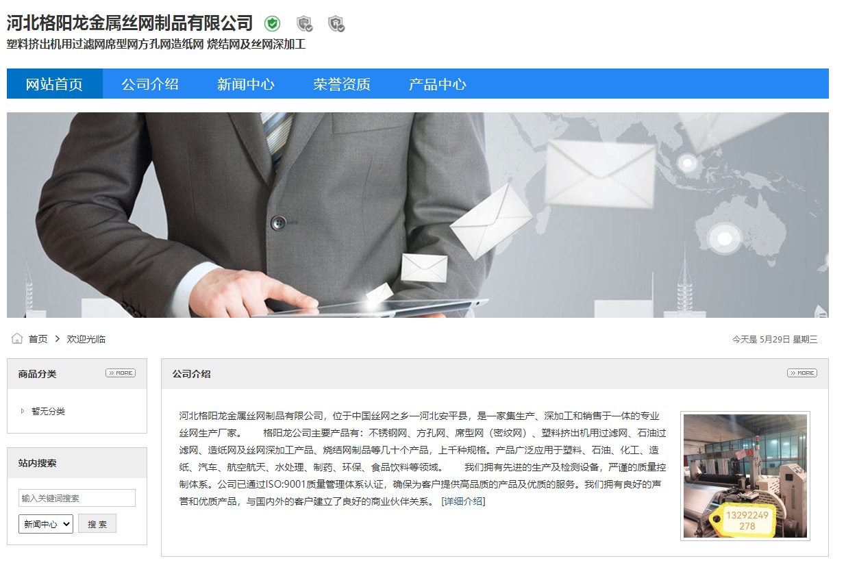 河北格陽龍金屬絲網制品有限公司,位于中國絲網之鄉—河北安平縣,是一家集生產、深加工和銷售于一體的專業絲網生產廠家。 格陽龍公司主要產品有:不銹鋼網、方孔網、席型網(密紋網)、塑料擠出機用過濾網、石油過濾網、造紙網及絲網深加工產品、燒結網制品等幾十個產品,上千種規格。產品廣泛應用于塑料、石油、化工、造紙、汽車、航空航天、水處理、制藥、環保、食品飲料等領域。 我們擁有先進的生產及檢測設備,嚴謹的質量控制體系。公司已通過ISO:9001質量管理體系認證,確保為客戶提供高品質的產品及優質的服務。我們擁有良好的聲譽和優質產品,與國內外的客戶建立了良好的商業伙伴關系。