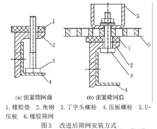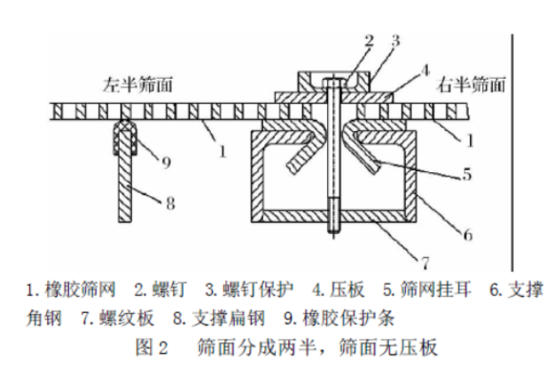 (1)將支撐梁(扁鋼)改為角鋼,再在角鋼上表面襯膠,減少篩網(wǎng)與角鋼的剛性接觸;