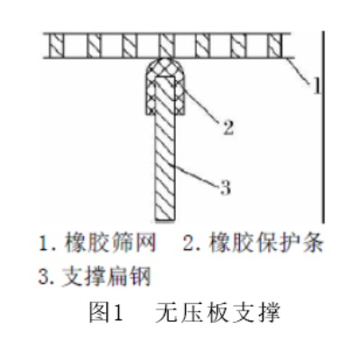 (1)大多的篩分設(shè)備制造廠,在制造篩子時(shí),為了提高有效分面積,都把篩網(wǎng)的支撐梁設(shè)計(jì)成一根側(cè)立的鋼板,再在鋼板上壓一塊或襯一塊橡膠保護(hù)條(如圖1所示)。由于支撐梁太小,所以上面沒(méi)法再加裝壓板。