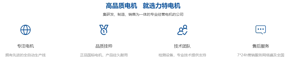 創新是企業發展的源泉,管理是企業的核心,質量是企業的生命。新鄉市力特電機有限公司嚴格抓質量管理,做到產品一次合格率百分 之百用戶滿意百分之百。公司以一個全新、積極的姿態,不斷引進人才、先進的生產技術和科學管理理念。一如既往本著以“質量求生存、以信求發展”的企業宗旨,不斷進取,推陳出新迎接新的挑戰。