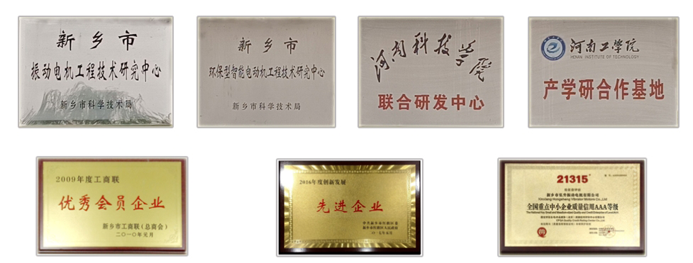 近年,公司先后榮獲新鄉市政府授予的“質量效益型企業”、“重合同守信用企業”,新鄉市技術監督局授予的“產品質量信得過企業”,新鄉市科學技術局認定的“新鄉市振動電機工程技術研究中心”。2020年公司通過國/家級“高新技術企業”認定。