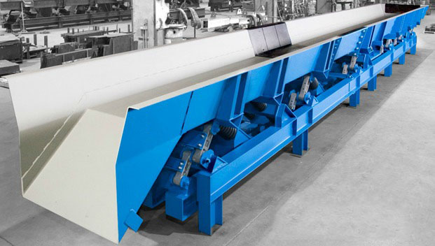 振動輸送機是一種無牽引構(gòu)件的連續(xù)輸送機械。它是利用機械共振原理來輸送物料的。振動輸送機主要由承載構(gòu)件、彈性元件及激振器等組成。激振器足振動輸送機的驅(qū)動機構(gòu)動力源,用以產(chǎn)生激振力,使承載槽產(chǎn)生持續(xù)的振動。激振力的大小直接影響著承載的振幅,其交變頻率即為輸送機的工作頻率。承載體為槽形或管形振動料槽,在振動過程中,將能量傳給物料,使之沿輸送方向作連續(xù)拋擲運動。承載體為參振質(zhì)體,需具有足夠的剛度和強度。減振支承裝置既是整機的支承裝置,又作減振用。