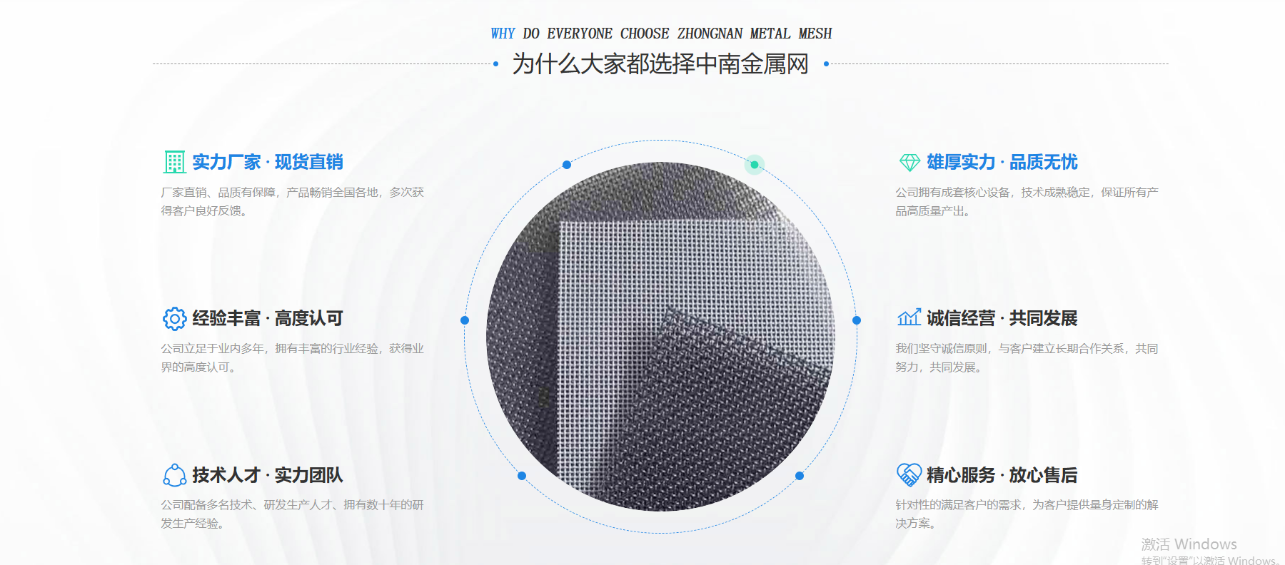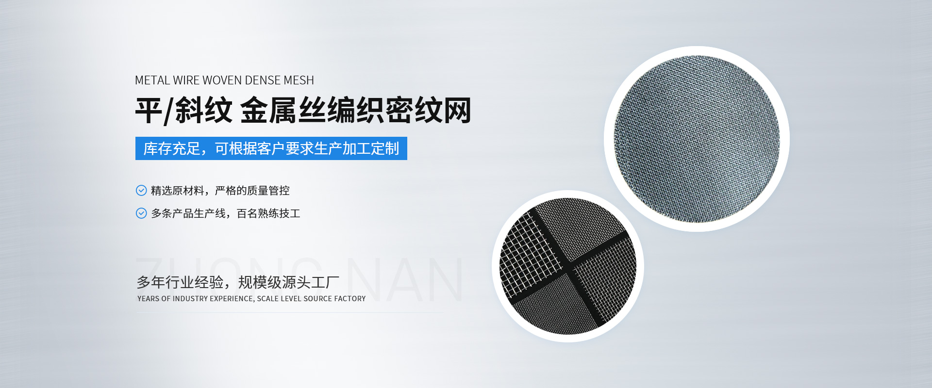 新鄉市中南金屬網有限公司成立于1999 年,公司設在河南省新鄉市。在過去的十幾年來,我們堅持以嚴格的管理措施、雄厚的技術力量、良好的工藝設施,質量上乘、信譽為上為原則,把樹立良好的企業形象為工作宗旨,歷經市場的嚴峻考驗并贏得廣大用戶的一致好評。金屬絲網編織結構形式有平紋和斜紋兩種方法,嚴格按照航空軍品標準HB1862—93和標準GB/T5330—2003標準,并等效采用國際標準ISO9044—90標準組織生產。