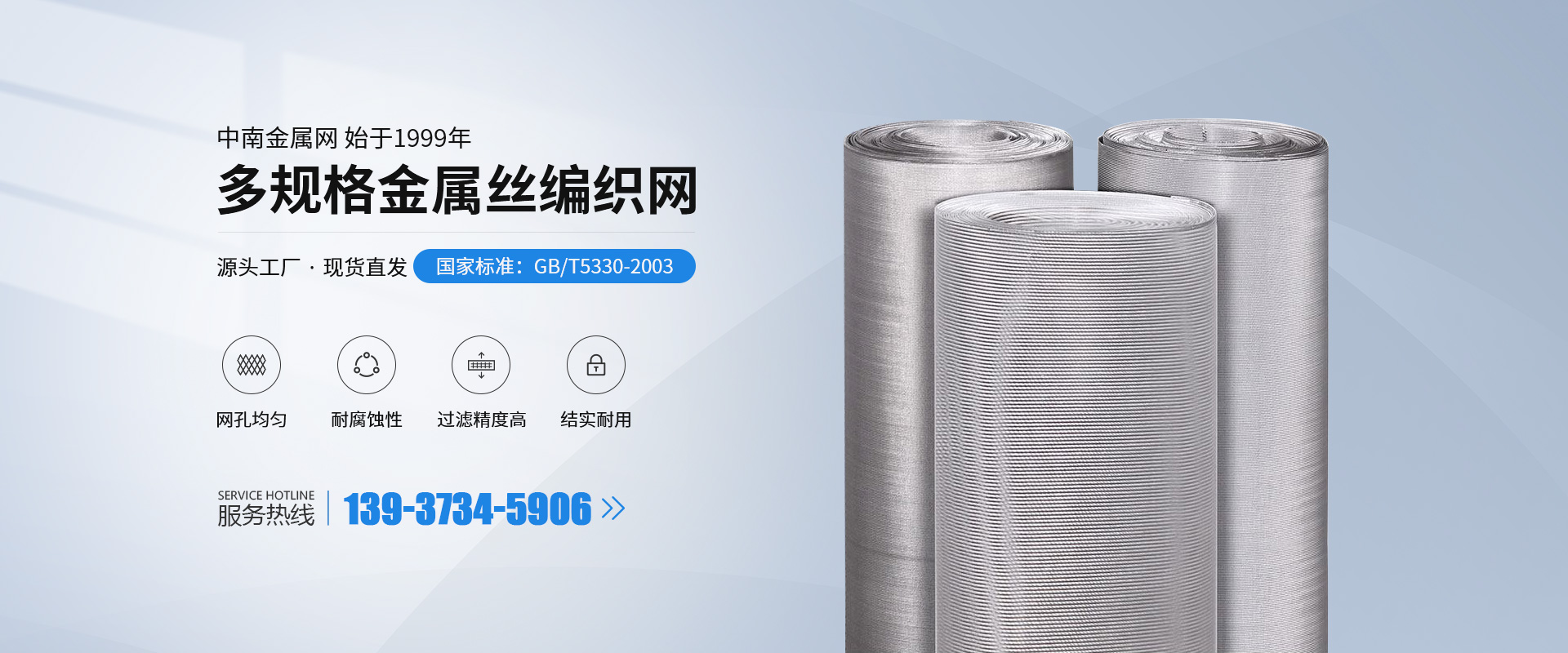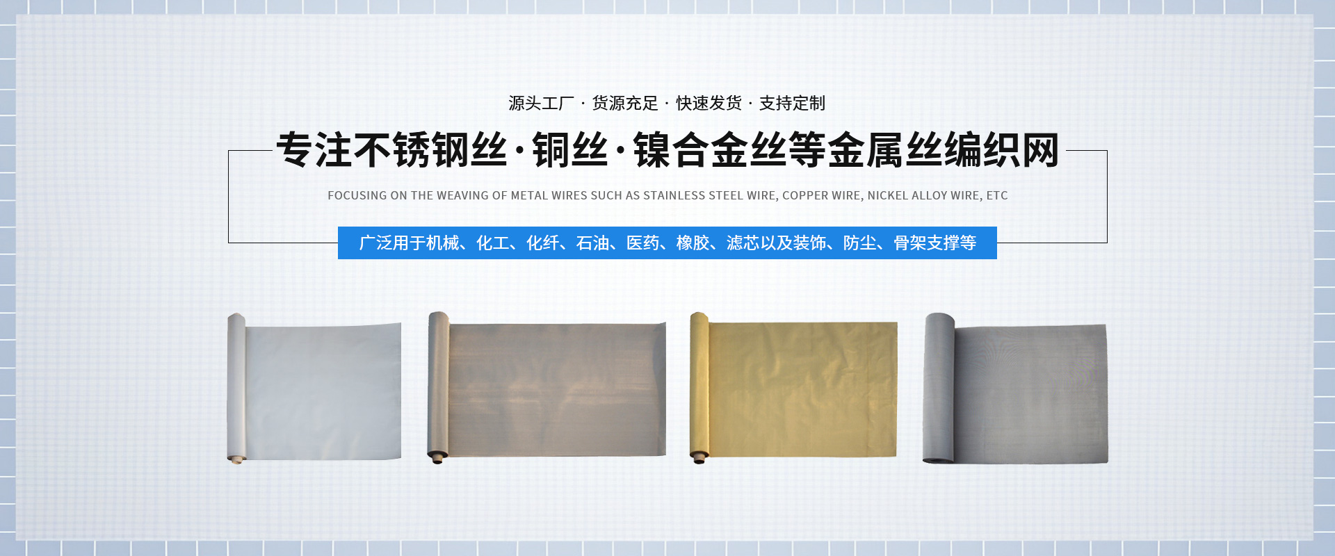 公司擁有生產設備和技術人員,主要生產不銹鋼篩網、磨料網、金屬絲編織方孔網、篩網、濾網 、篩分網 、過濾網、不銹鋼網、絲網、金屬絲網、金屬絲編織密紋網、特種網、不銹鋼密紋網、荷蘭網、席型網。絲網材質選用黃銅、錫青銅、不銹鋼、純鎳等。席型網規格7/44目—500/3500目,方孔網規格1/2目—500目,網孔25mm—0.028mm,產品廣泛用于機械、化工、化纖、石油、醫藥、橡膠、濾芯、固體果粒篩分、流體過濾以及裝飾、防塵、骨架支撐等。