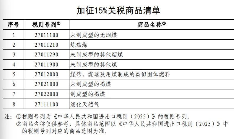 一、對煤炭、液化天然氣加征15%關稅,具體商品范圍見附件1。