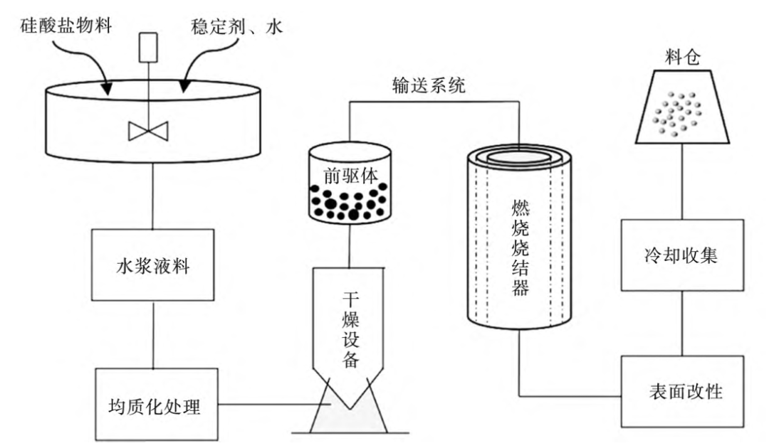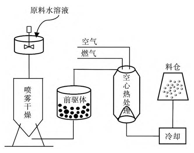 噴霧造粒法制備空心玻璃微珠的主要原理是使用壓力、離心或氣流式霧化器將含有玻璃粉和發泡劑的懸浮液霧化,液滴中的液體在蒸發后成為坯體,將坯體送入燒結爐中燒結形成空心玻璃微珠。