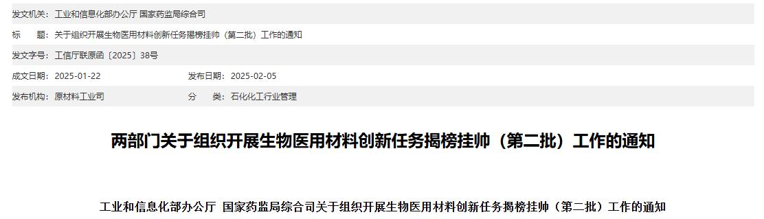 中國粉體網(wǎng)訊2月5日,工業(yè)和信息化部辦公廳和國家藥監(jiān)局綜合司發(fā)布“關(guān)于組織開展生物醫(yī)用材料創(chuàng)新任務(wù)揭榜掛帥(第二批)工作的通知”。
